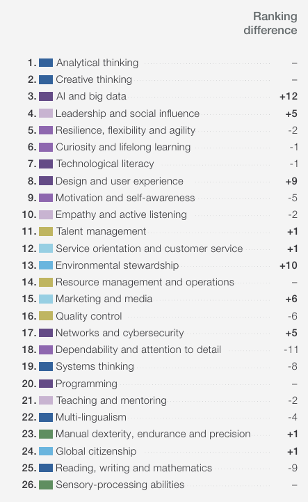 Podemos ver que el pensamiento analítico y el pensamiento creativo se mantienen en los primeros puestos, pero la inteligencia artificial y el big data ha subido hasta el tercer puesto.