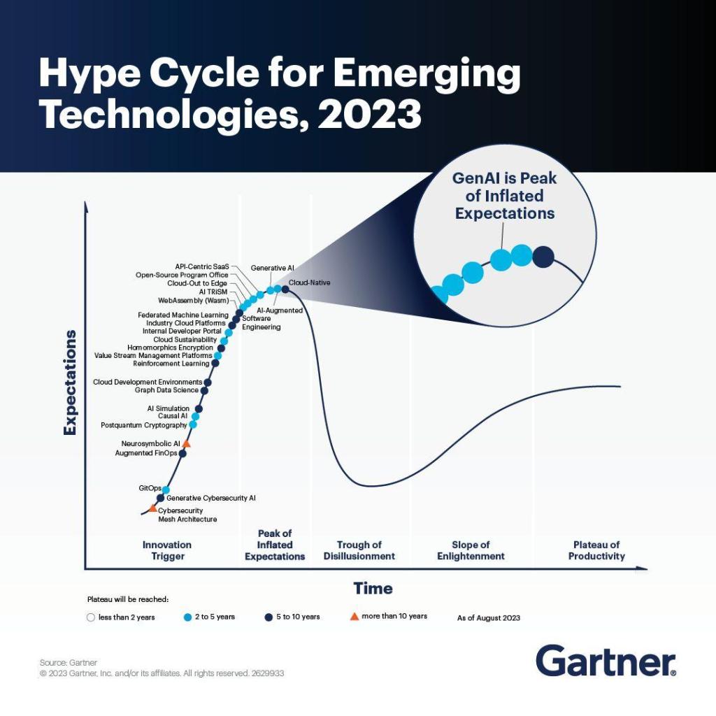De hecho, como podemos ver en la gráfica de Gartner que acompaño abajo, en un momento en el que nos encontramos en el punto de máximo de inflación de expectativas, y a las puertas de un valle de desilusiones.