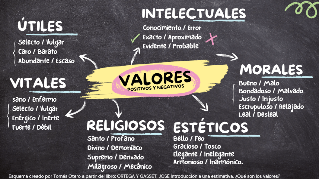 Para reconocerlos, diseñé una imagen que refleja la clasificación de Ortega y Gasset sobre los valores, como se presenta en su ensayo «Introducción a la Estimativa. ¿Qué son los valores?», que puedes descargar en PDF aquí.